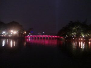 A few meters down the main road is the beautiful Hoan Kiem Lake with the Red Bridge over it. There are shops and restaurants around the lake. At night, the city is all lit up, with fancy lights everywhere, and it was quite safe to walk around visiting night markets, etc.