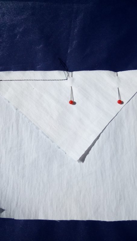 Pin the bias edge to the straight edge, placing pins perpendicular to the seamline, approximately 6 cm apart. Stitch the seam with the bias edge on top, and remove the pins as you stitch.