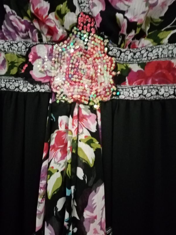 I love the neckline and the fabric with its beautiful floral print, but the dress had a long fringe attached to the waist with a beaded motif, which I removed. I used the flounce to make the mock hollow sleeves. The lining that was used for this dress is very beautiful but heavy, so I replaced that with my favourite lining to make it lightweight and perfect for taking on holiday. I also inserted a longer side zipper so that I can slip into the dress without any effort.