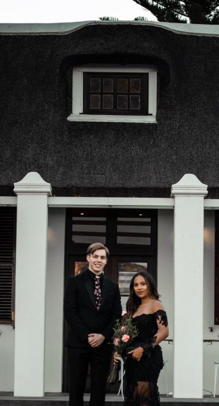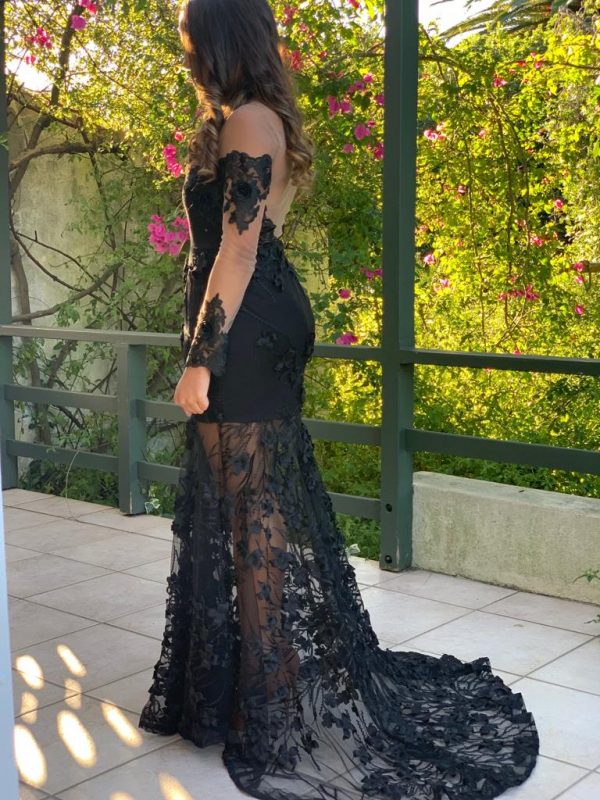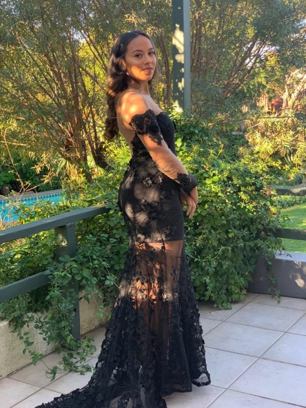 Fabrics used to make this stunning gown: Gia Stretch Satin, Tulle, and Lace.