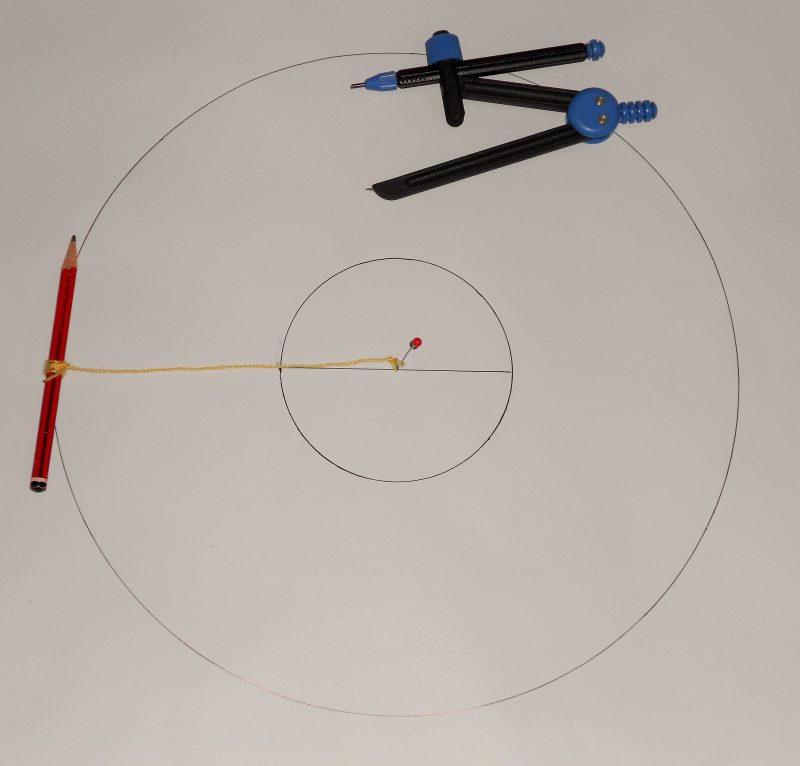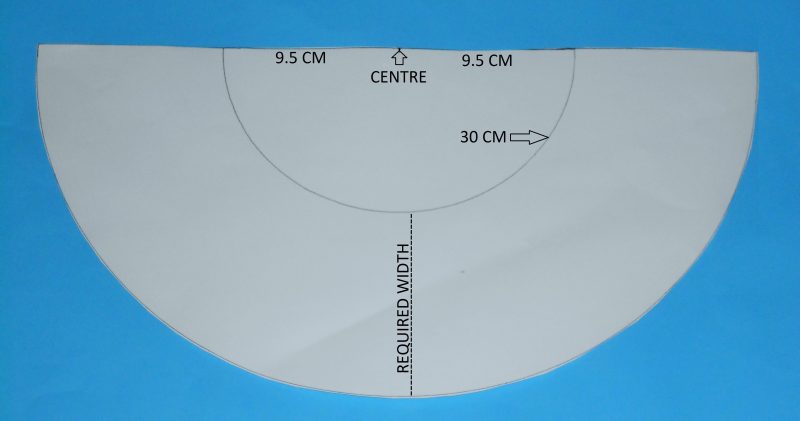 Use a compass or a marking pen attached to a piece of string. Draw the inner circle, which should measure the required length of the flounce. Decide on the width of the flounce and draw the outer circle.