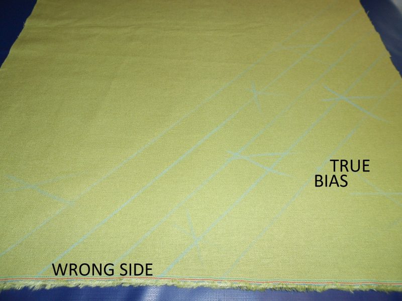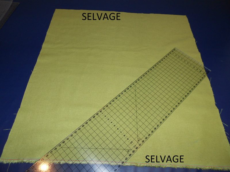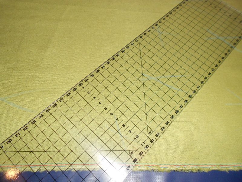 Place a sewer’s ruler on the wrong side of the fabric at a 45-degree angle.