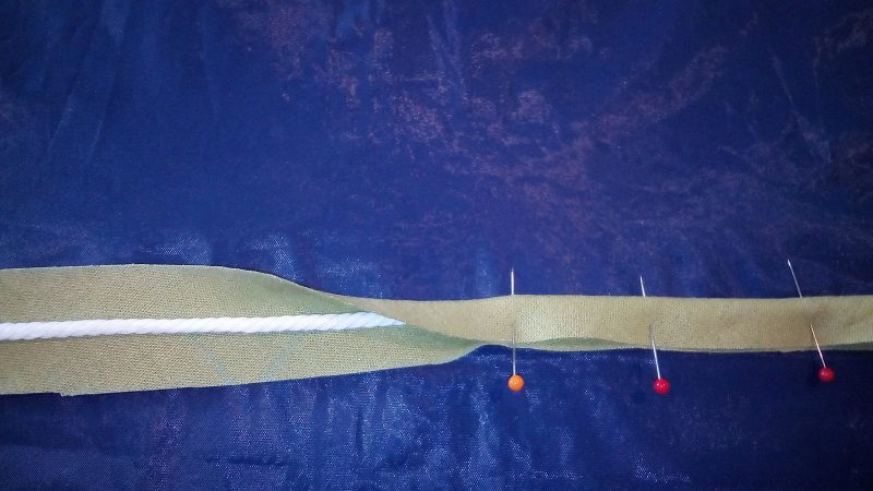 First, select the thickness of the cord. Place the cord in the middle and on the wrong side of the bias strip. Fold the fabric over to encase the cord and pin. Attach a zipper foot to the machine and stitch close to the cord without catching the cord in the needle.