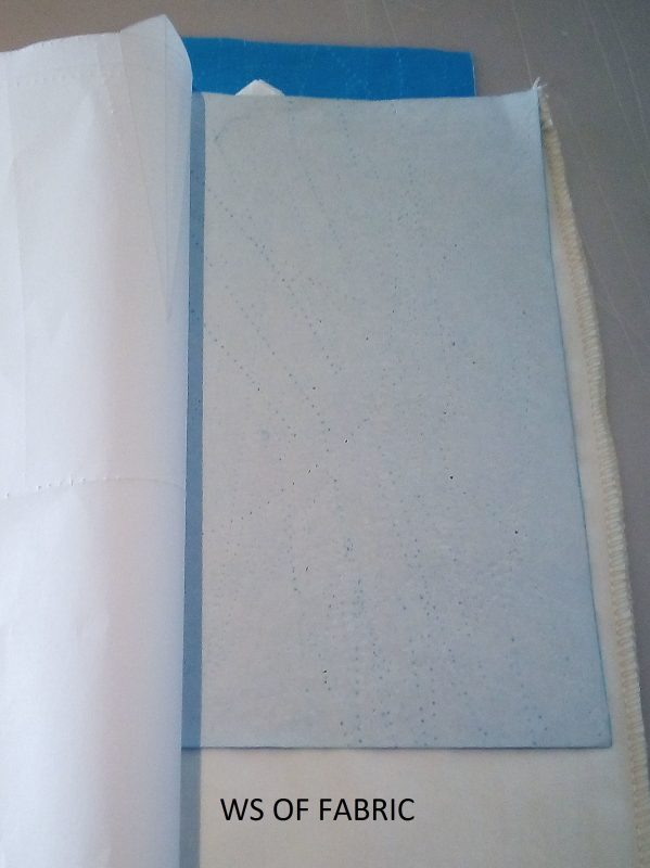 Fold the fabric right sides together. Place the waxed side of the carbon paper on the wrong sides of the fabric. Pin the pattern to the fabric over the carbon paper.
